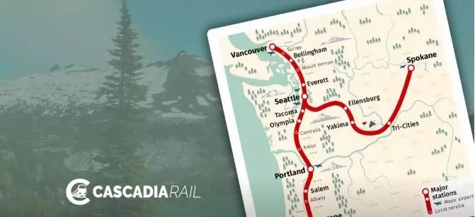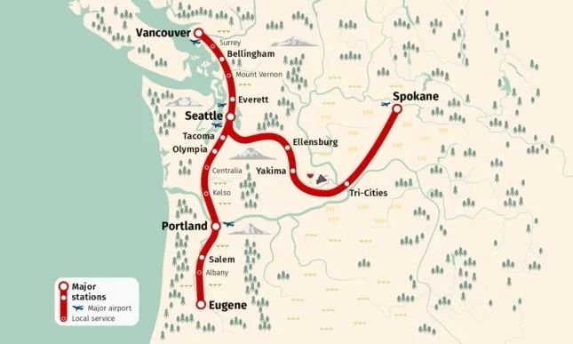 按照目前的设想,这条路线会在BC省-华盛顿边境以北到达大温哥华地区,在华盛顿-俄勒冈边境以南到达波特兰,在这三个城市之间会有一些停留。