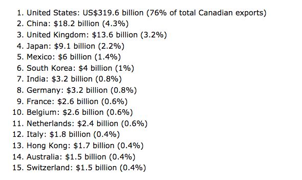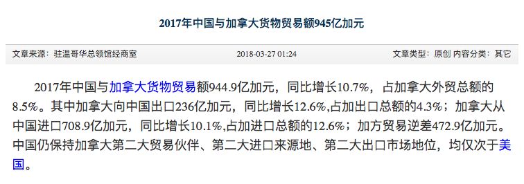 这是中国公布的贸易数字,中国和加拿大统计方法不同,最终导致数额有一定区别,前面列的是经过调整的结果,这个是中国公布的未调整结果(即中国认为进出口平衡性更好的统计方法),虽然看着比例大了一些(距离和美国仍然是零头),但即使按照中国的统计,加拿大购买中国的东西远远多于加拿大卖给中国的东西,在中国统计下,加拿大向中国出口236亿加元,加拿大从中国进口708.9亿加元,加方贸易逆差高达472.9亿加元(353.35美元)