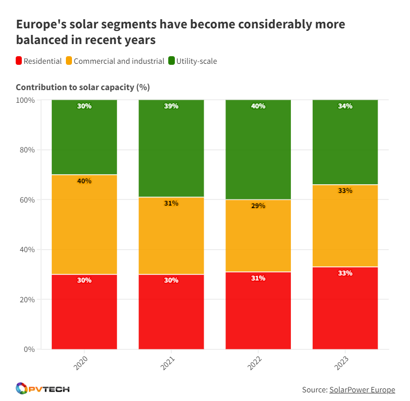 地区和分行业差异 2022年,西班牙将超过德国,成为欧洲太阳能装机容量最大的国家,新增装机容量将达到8.4GW,德国仅为7.4GW。 然而,报告预计,德国将在今年年底重回榜首,预计德国的新增装机容量将几乎翻倍,达到14.1GW,西班牙的新增装机容量将缩减至8.2GW。 在报告预测的2023年十大太阳能市场中,西班牙是唯一一个2023年新增装机容量低于上一年的国家。报告指出,虽然西班牙太阳能行业在2022年实现了”一个重要的里程碑”,但屋顶光伏发电的放缓可能会阻碍这一行业的长期发展。 根据SolarPower Europe的数据,西班牙未来七年的屋顶装机容量要达到每年1.9GW,才能实现西班牙国家能源与气候计划(NECP)中规定的19GW国内太阳能容量的目标,而这一数字在过去十年中仅实现过一次。 展示2020年以来欧洲太阳能行业构成的图表。来源:PV Tech 如上图所示,报告还展示了欧洲太阳能行业组合在过去六年中发生的变化,大型地面光伏和户用太阳能现在对这一行业的贡献要大得多。2020年,欧洲大陆40%的太阳能发电量来自工商业项目,而户用和大型地面光伏项目的发电量占比仅为30%。 SolarPower Europe预计,2023年,这一行业将几乎完全由这两部分组成,大型地面项目将占行业装机容量的34%,工商业和户用太阳能项目将占33%。 本土光伏制造目标 然而,欧洲制造业的产量却不尽如人意,报告作者指出,SolarPower Europe最初提出的、至2025年欧洲多晶硅、硅锭、硅片、电池和组件年产能达到30GW的目标”似乎不再可行”。 报告认为,2030年将是一个更现实的时间框架,因为欧洲多晶硅制造业已具备年产26.1GW材料的能力,但硅锭、硅片和电池制造业的效率仍然存在问题,这些行业每年总共生产4.3GW组件。 不过,欧洲逆变器制造业的健康状况较好,每年可生产82.1GW逆变器,这一数字符合REPowerEU的制造目标,REPowerEU是欧盟至本十年末太阳能装机容量达750GW计划的组成部分。 报告作者建议,欧洲各国政府可以采用类似美国《通货膨胀削减法案》和印度《产能挂钩激励计划》的方案,这两个方案都鼓励私人和公共机构加大对太阳能制造的投资。 这些结论与SolarPower Europe在9月份所称的”岌岌可危的形势”如出一辙,由于太阳能开发商能够从美国和中国采购更便宜的材料和组件,欧洲制造业在全球范围内的积极性受挫。