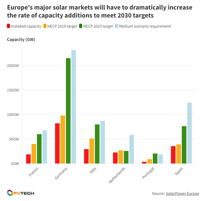 国家节能计划和七年规划 报告还探讨了欧洲太阳能行业的未来,并对未来七年的行业发展做出了预测。欧洲的许多太阳能计划由各国政府的国家能源政策计划(NEPC)管理。该计划于2019年在一些欧洲国家推出,并于今年更新,用于管理各国至2030年的太阳能目标。 如果2023年的所有更新目标都能实现,那么至本十年结束时,欧洲的太阳能电力容量将比最初预期高出90GW。然而,如下图所示,欧洲大陆一些最大的太阳能市场远远落后于2019年和2023年设定的装机总量目标,其中荷兰最接近于实现这两组目标。 展示部分欧洲主要国家太阳能发电目标的图表。来源:PV Tech 所有这些国家也都远低于SolarPower Europe对全球太阳能行业的”中等”情景预期。这一方案包括2023年全球新增341GW太阳能装机容量,以及2027年全球太阳能装机容量扩大至3.5TW的内容。西班牙和荷兰的情况尤其令人担忧,这两个国家政府的目标是接近或低于”欧洲太阳能中等方案”所要求的装机总量的一半。 葡萄牙的情况值得乐观。在SolarPower Europe所分析的欧洲大陆中,它是唯一一个在本国更新NECP中,超过行业机构中等方案预期的国家。虽然实现这一目标将是一个挑战,但欧洲许多国家的雄心越来越大,其中许多国家都在最新的NECP更新中大幅调高了太阳能电力目标,这为欧洲太阳能行业实现目标带来了希望。 政策建议 为帮助欧洲太阳能行业更好地实现其目标,SolarPower Europe还为本十年的剩余时间提出了一系列政策建议,其中包括保持SolarPower Europe所称的”有利于太阳能光伏发电的投资环境”,改善电网和灵活性基础设施。 SolarPower Europe致力于一系列基础设施和物流发展,包括启动一项加快并网的行动计划,从而改善欧洲太阳能行业的方方面面。 SolarPower Europe还呼吁改进规划和许可流程,实现欧洲大陆的太阳能供应链多样化,从而发展欧洲自身的制造业,降低对从中国等市场进口的依赖。 SolarPower Europe还指出,为了支持欧洲大陆太阳能供应链所有环节的发展,至2025年,欧洲太阳能行业将需要雇佣100万人,而2022年的雇佣人数约为64.8万人。SolarPower Europe表示,各国政府”必须恢复技术教育和就业”,并”加大促进工人流动的力度”,这是全球太阳能行业改善全球员工培训和部署的广泛倡议的一部分。