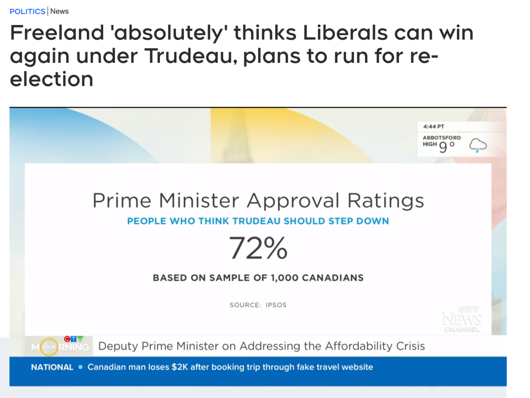 方慧兰说:“我真的必须告诉你……我从不相信这一点,我的关注点不在网上发布的民意调查上,而是在我现实中遇见的人。我在全国各地旅行时遇到的加拿大人是我的关注点。”
