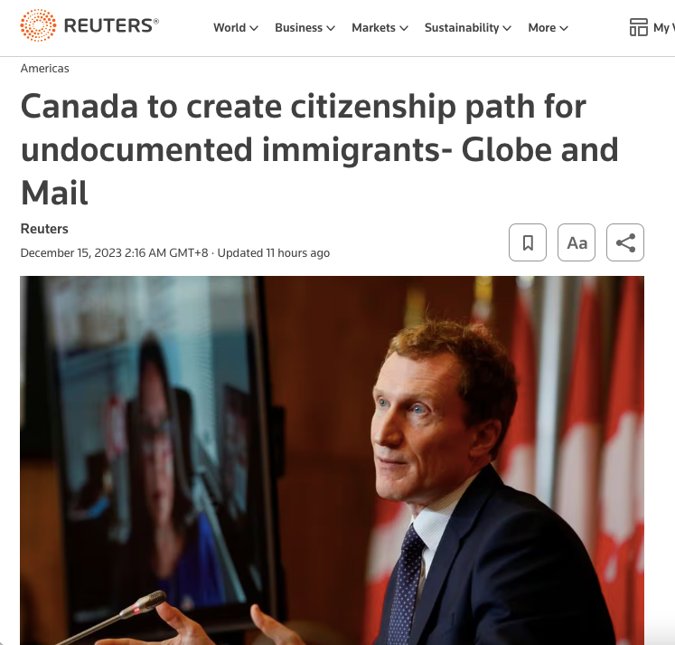 新闻来源:https://www.reuters.com/world/americas/canada-create-citizenship-path-undocumented-immigrants-globe-mail-2023-12-14/